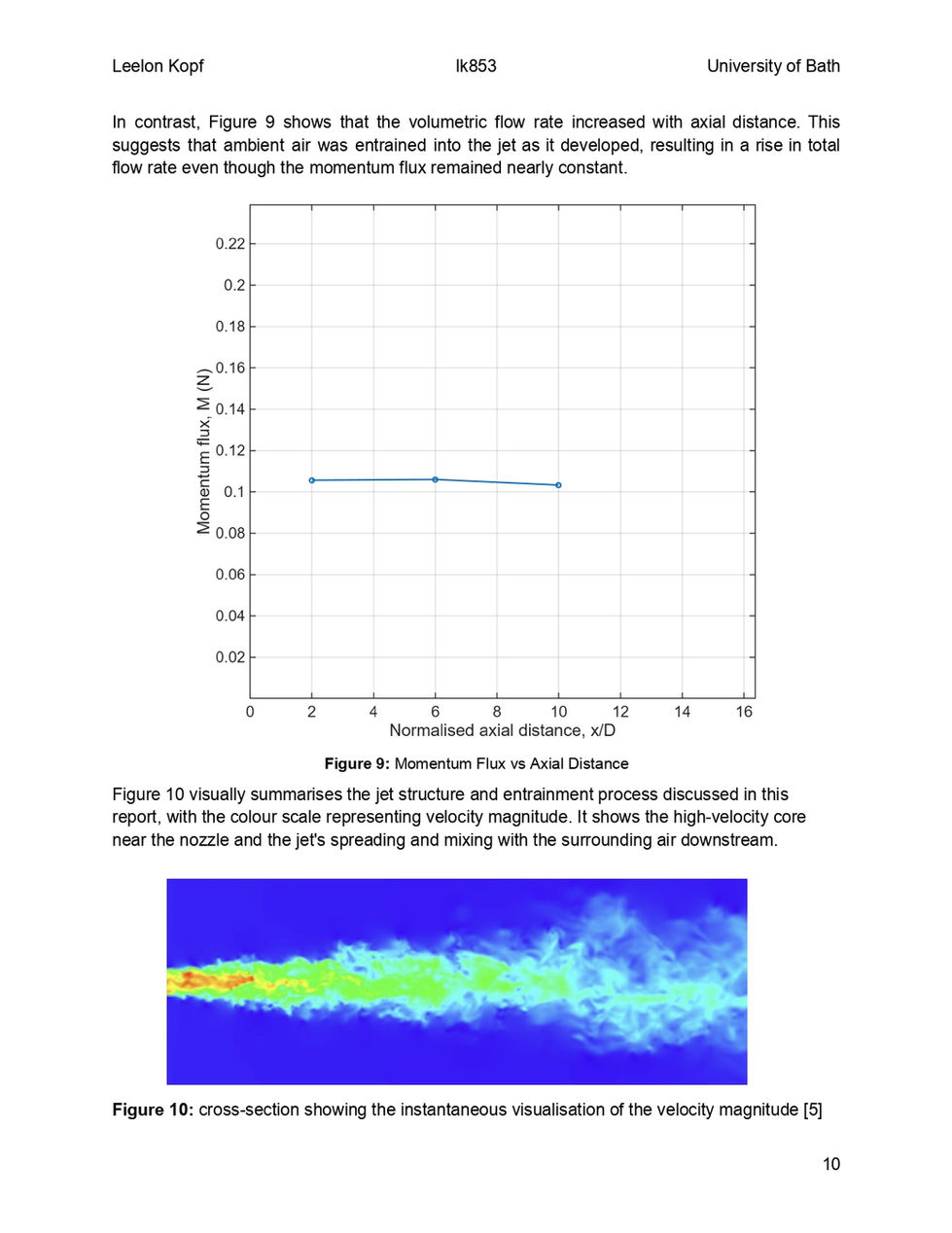 Produced a thermofluids report analysing the behaviour of a free circular air jet using pitot-static measurements and an inclined manometer. The project involved measuring centreline and radial velocity profiles, then using the data to study jet spreading, entrainment, volumetric flow rate, and momentum flux. The results showed a clear core region over the first 170 mm from the nozzle, followed by a steady decrease in centreline velocity and broader radial profiles downstream. Momentum-flux deviation averaged 9.24%, showing approximate agreement with the theoretical expectation of momentum conservation. This developed my ability to apply Bernoulli’s equation, process experimental flow data, and connect measured velocity profiles to real fluid behaviour.