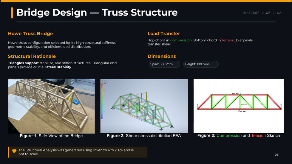 I performed a stress analysis on a Howe truss bridge to see how the structure carried loads through its different parts. I looked for areas under tension and compression, estimated displacement, and checked how the bridge reacted when loaded. Using Autodesk Inventor FEA, I visualized the stress distribution to back up my design choices. This process helped me link theory to practice and made my final bridge presentation more accurate and clear.